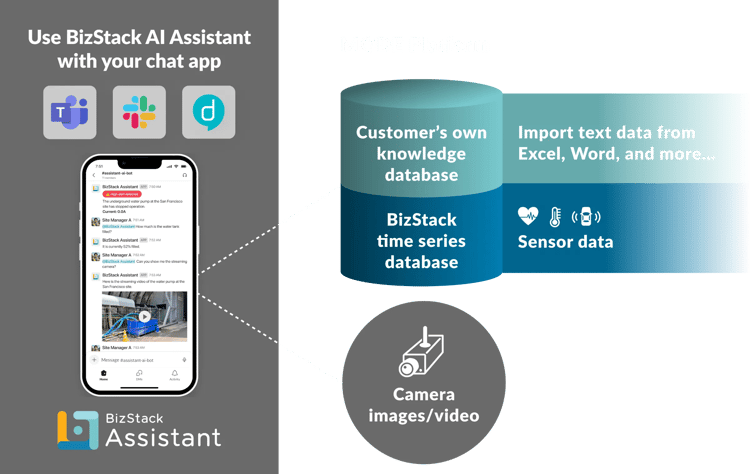 Unlock the power of data with BizStack Assistant, your virtual team member. Seamlessly integrated with collaboration tools like Slack, Microsoft Teams, and Direct, BizStack Assistant empowers users to engage with IoT data using natural language, transforming every worker into a data expert. Gain valuable insights effortlessly and make informed decisions faster.