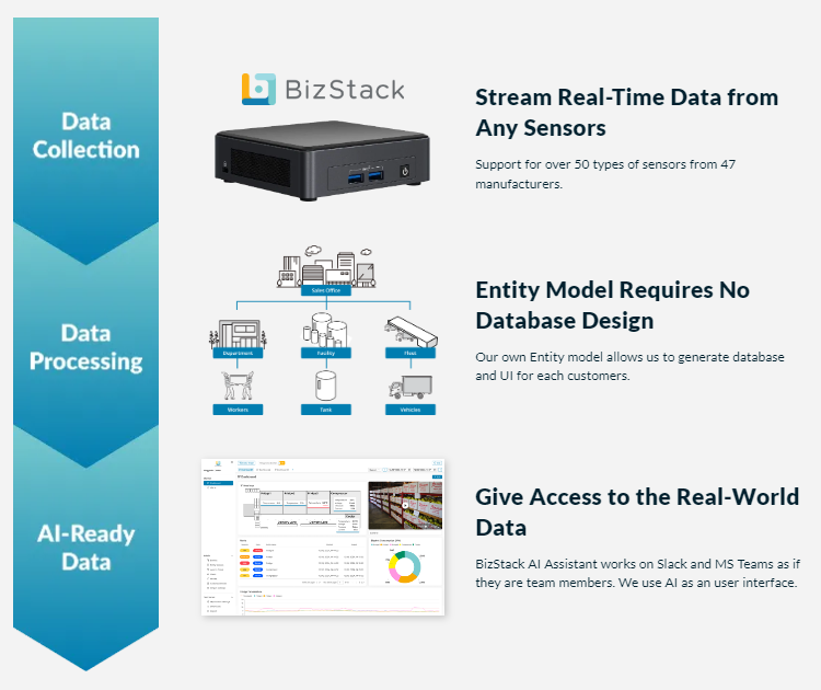 The BizStack Platform Our flexible IoT solution, enhanced by AI, is designed to rapidly connect and manage devices across diverse environments. With adaptable functionalities, BizStack serves a wide range of industries, providing businesses with the agility to scale and evolve in real time.